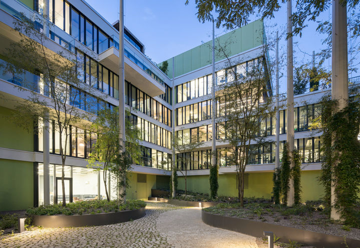Der Dachterrassen und Innenhöfe als „Grüne Inseln“ laden die Mitarbeiter zum Arbeiten im Freien, Verweilen und zum Austausch ein. Die einzelnen Flächen werden durch geschwungene, intensiv bepflanzte Grünflächen und Hochbeete in kleinräumigere und individuell nutzbare Räume gegliedert. Lichtkronige Bäume in den Innenhöfen und schirmförmige Solitärsträucher auf den Dachterrassen in Hochbeeten oder modellierten Beeten bieten schattige Plätze. Der Überbau über der Tiefgaragenrampe wird durch ein ansteigendes Hochbeet kaschiert. Die linearen Sitzelemente dienen als Aufenthaltsbereiche und setzen räumliche Akzente.